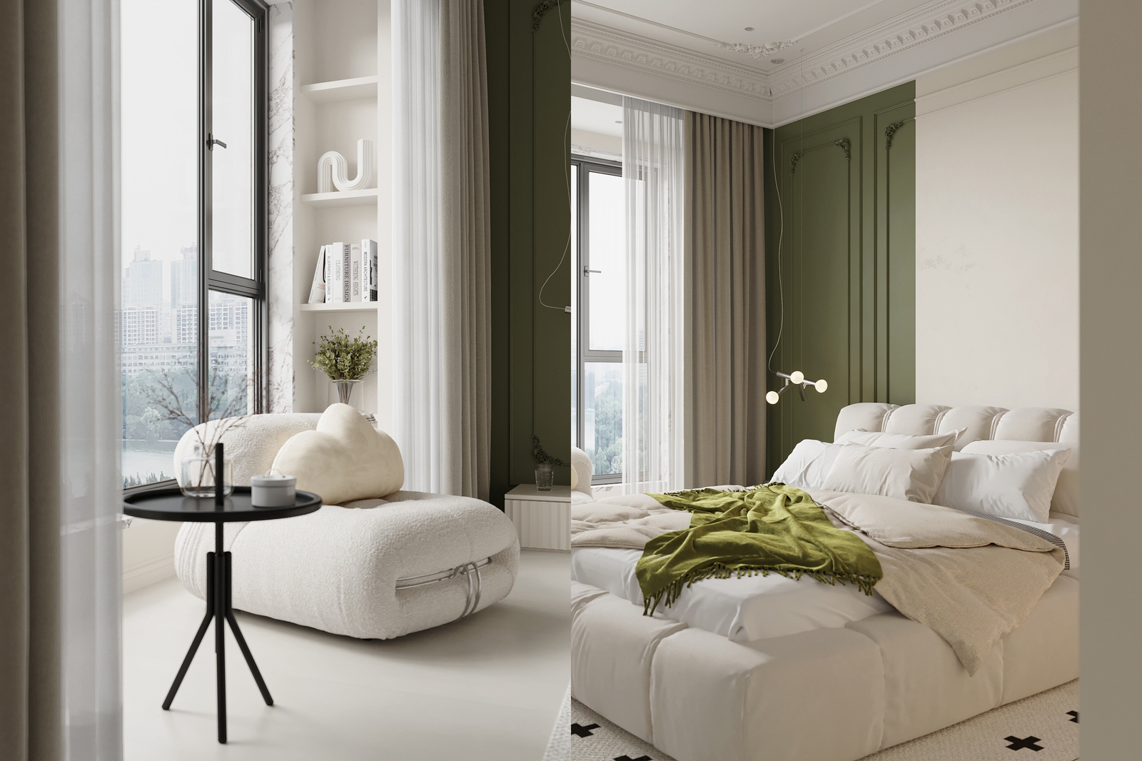 复古绿的选择也花了不少心思,最终选了低饱和的橄榄绿,不突兀、不张扬!客厅电视墙局部做了橄榄绿护墙板、吸睛的橄榄绿单人沙发,餐厅也做了同色系呼应,搭配绿色绒布餐椅,让色彩在整个空间里自然流动,既打破了奶油白的单调,又增添了复古氛围感,高级感瞬间拉满。
