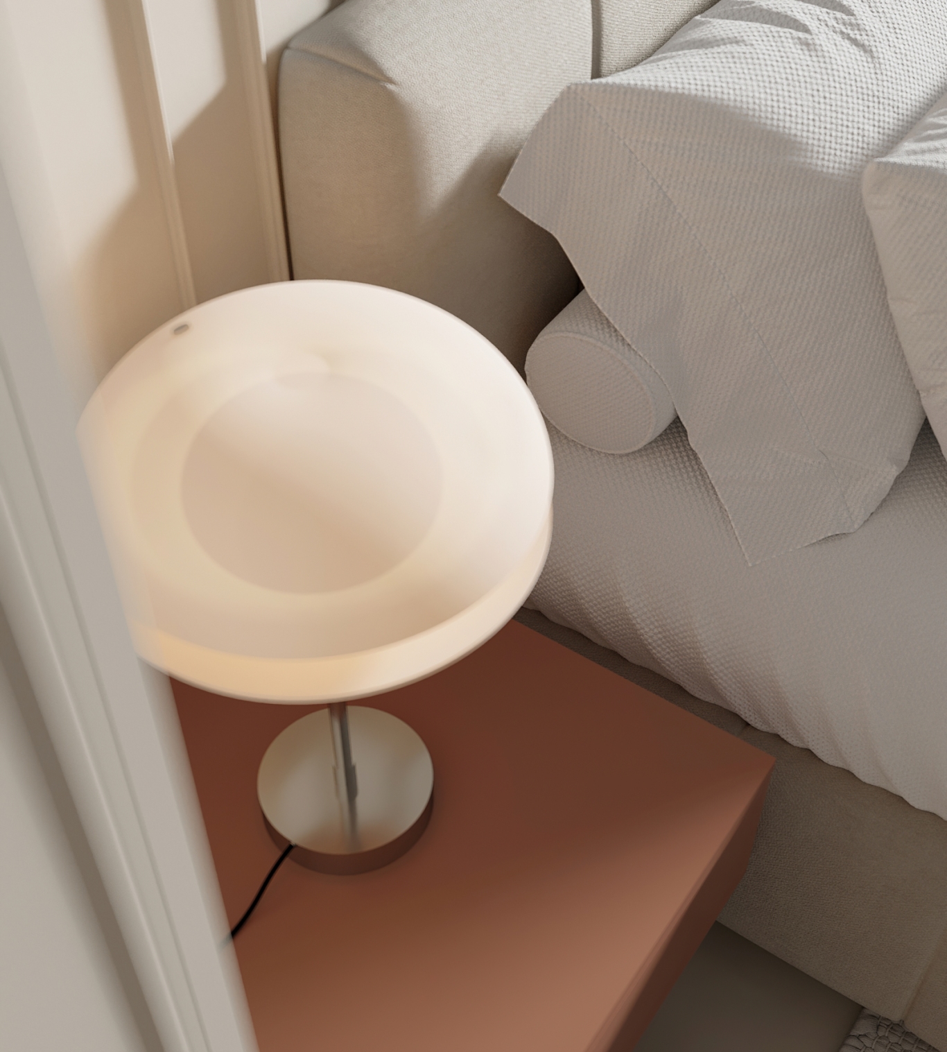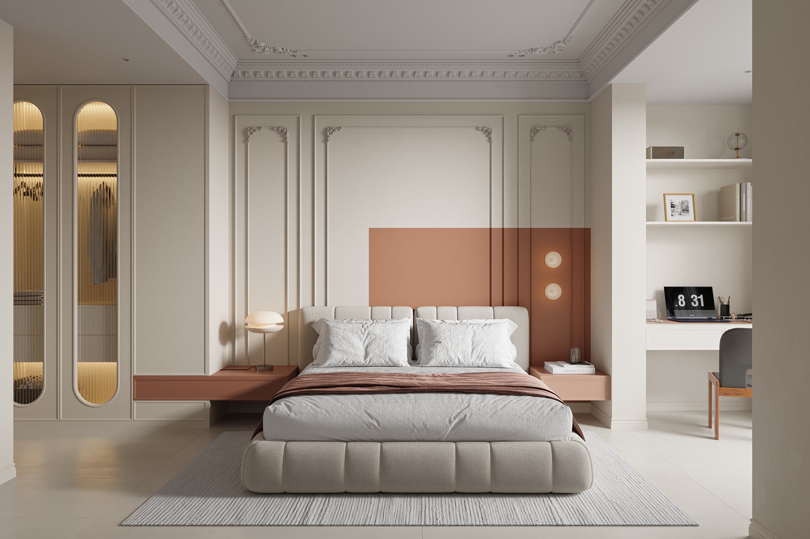 卧室:卧室延续了整体的配色思路,依旧是奶油白+撞色设计,主卧背景墙做了橄榄绿跳色,次卧做了暖橘色跳色,搭配同色系的悬浮床头柜,视觉上和谐又有层次,不会显得单调。衣柜选用弧形玻璃门设计,既通透又能展示衣物,避免了传统衣柜的压抑感,收纳空间也足够,满足日常衣物收纳需求。