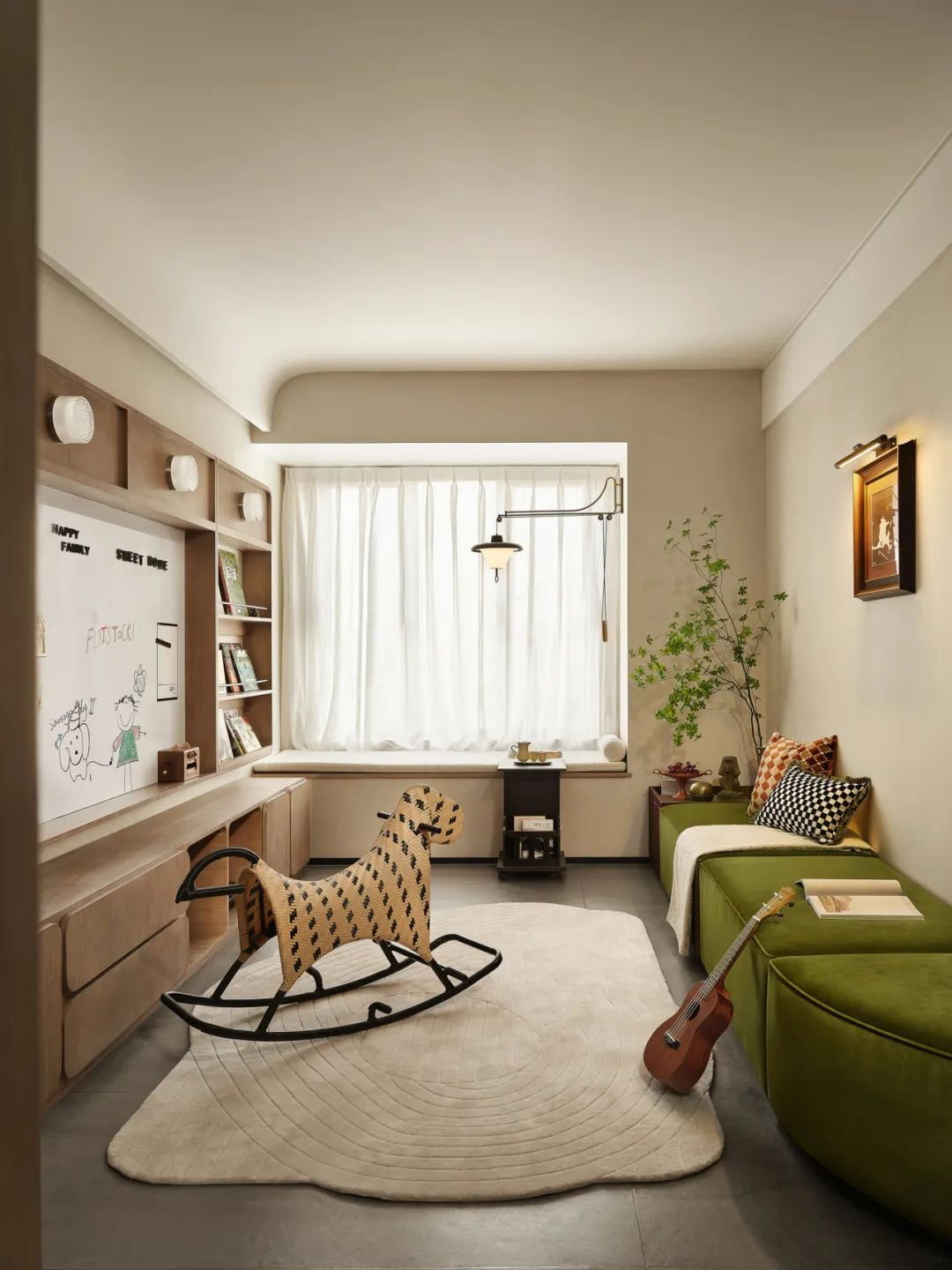 墙面玩出花样:装一面磁性黑板墙或白板墙,做圆角边框,孩子可随意画画、贴磁贴,释放创造力;也可以选可移除的环保卡通墙贴,随孩子年龄更换风格,省心又好看;软木留言墙也很合适,贴孩子的作品和照片,用圆头安全图钉,兼顾美观与安全。