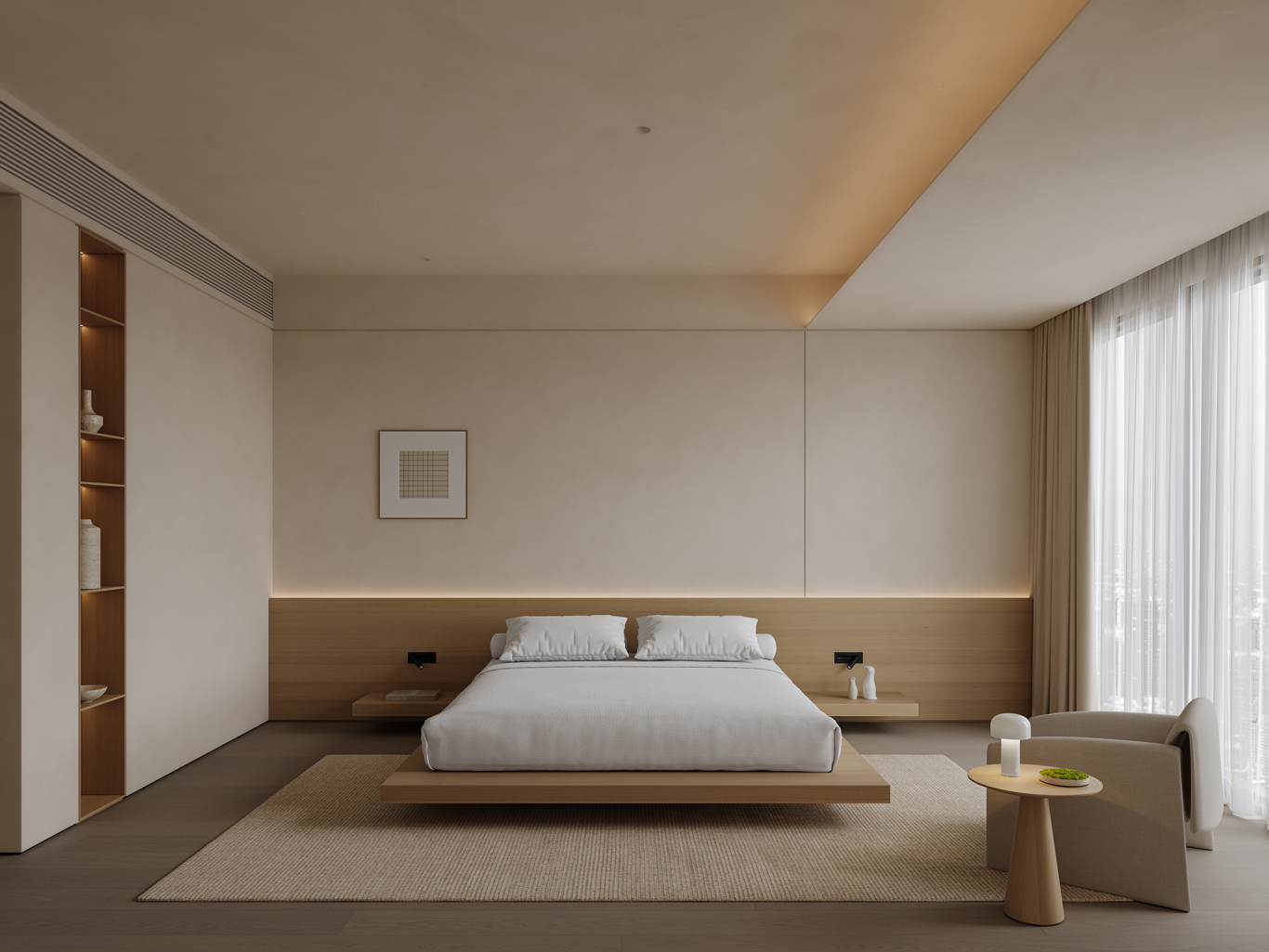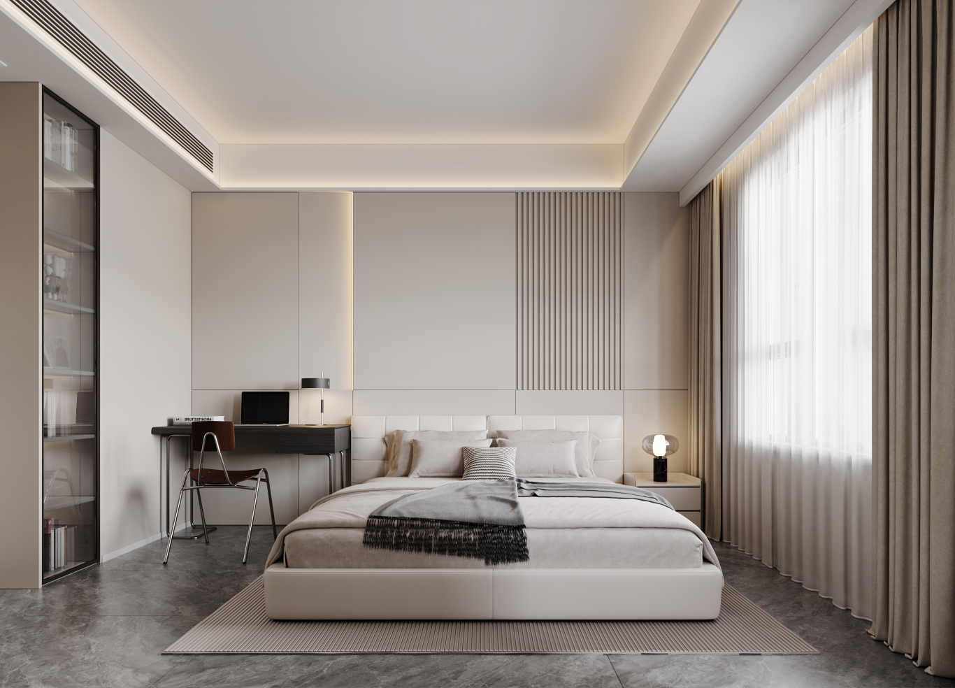 大主卧(≥16㎡)可选择1.8m/2m床,搭配双床头柜、大衣柜,还能加入梳妆台、休闲椅、飘窗柜,打造舒适休闲区。