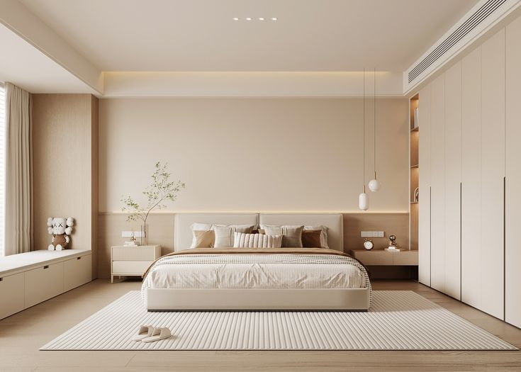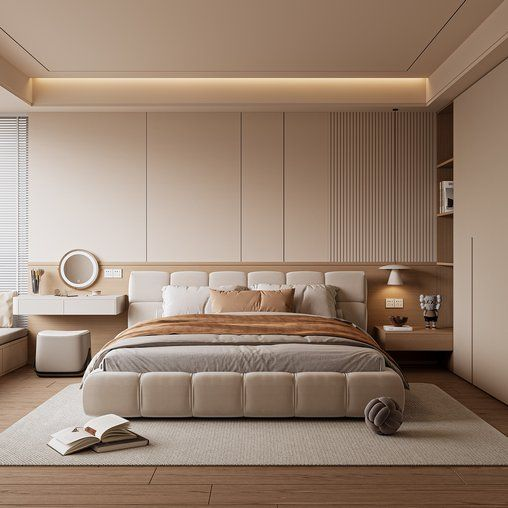 首先,床头一定要靠墙,优先选择不靠卫生间、不靠外墙的墙面,既能保证隐私性,还能隔绝卫生间的潮气和外墙的噪音,睡觉更安稳。其次,进门千万不要正对床,尤其是正对床头,不仅缺乏隐私感,视觉上也会很压抑,实在避不开的话,可以用屏风或矮柜做遮挡。